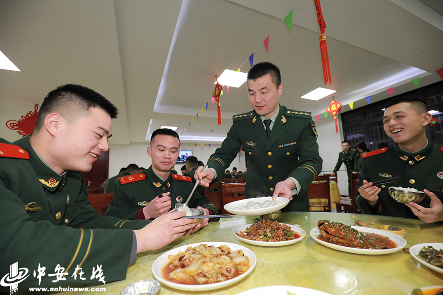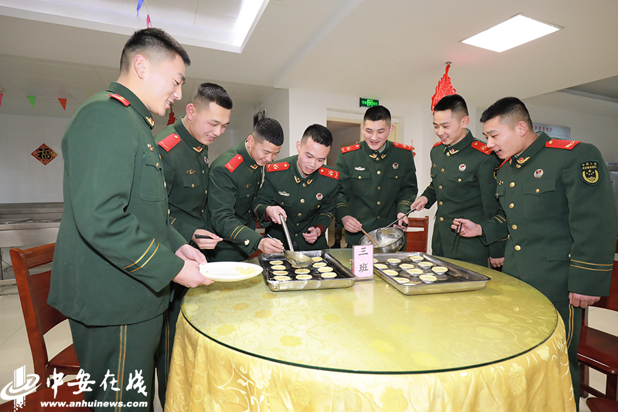 2月18日是元宵節的前一天,武警安徽省總隊合肥支隊十九中隊里年味濃濃。圖為晚飯時,指導員王宏為戰士盛湯圓。