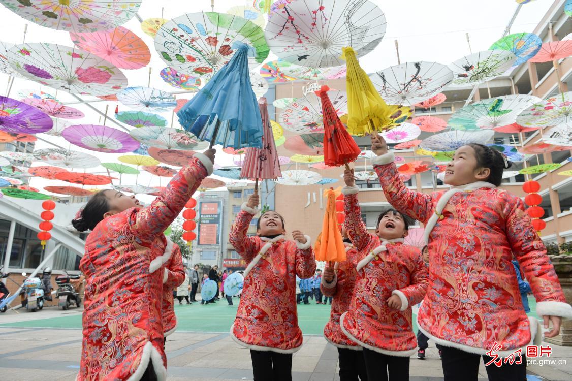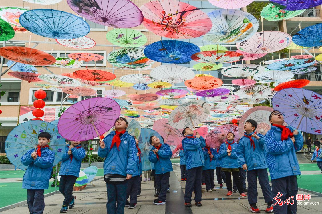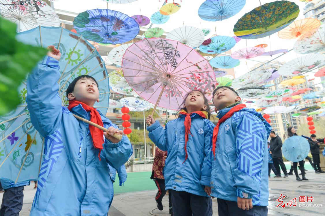 2019年2月19日,浙江省長興縣長興一小縣前街校區開展"紙傘綻放迎開學"活動,一千余把油紙傘裝扮校園,迎接開學。據悉,這些油紙扇都是學生們寒假里動手繪制而成,旨在讓孩子們感受傳統文化的獨特魅力。(吳拯攝/光明圖片)