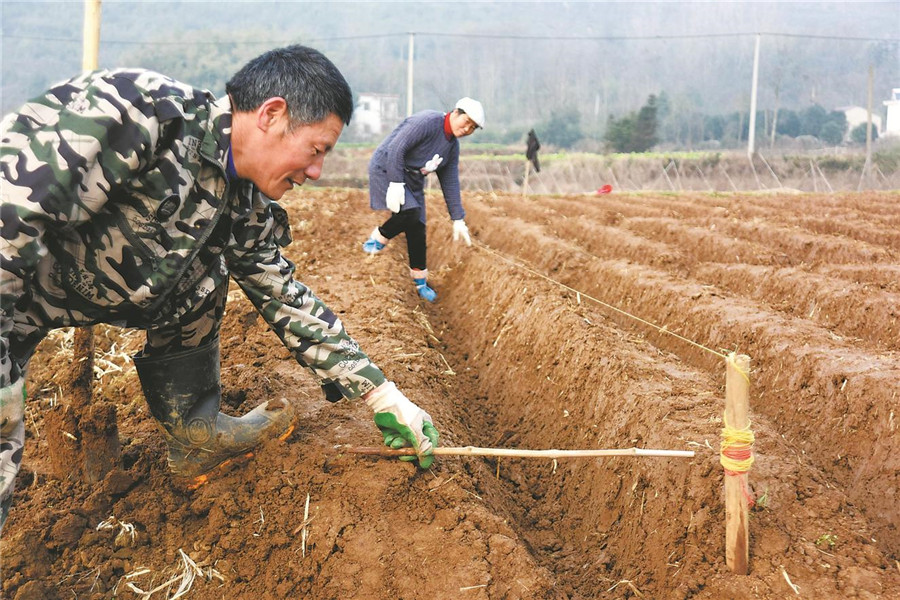 2月24日,在銅陵市義安區(qū)天門鎮(zhèn)農(nóng)井村,姜農(nóng)傳承古老春耕方法,人工制作“高隴低溝”姜田。 本報(bào)通訊員 過仕寧 攝