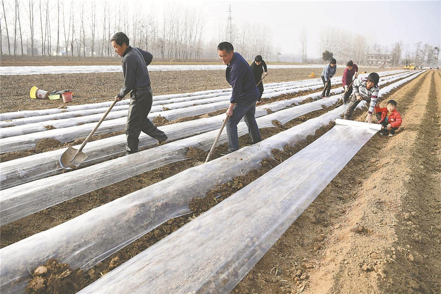 2月25日,在亳州市譙城區(qū)魏崗鎮(zhèn)大陳村,農(nóng)民為種植的土豆覆蓋地膜。本報(bào)通訊員 劉勤利 戴明 攝
