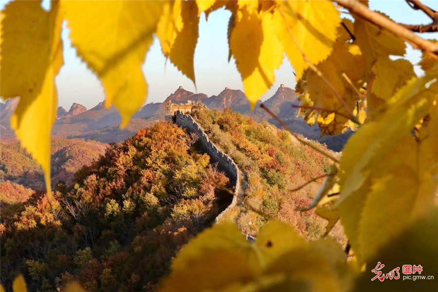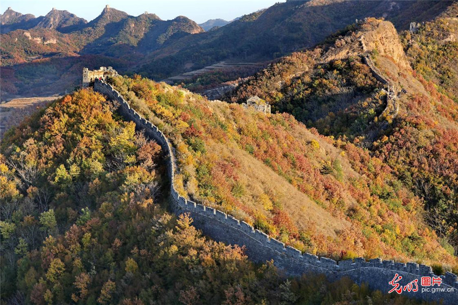 2019年10月21日,河北省秦皇島市海港區駐操營鎮的古長城與秋葉相互襯托,在多彩斑斕的顏色襯托下美不勝收,宛如一幅徐徐展開的畫卷。(