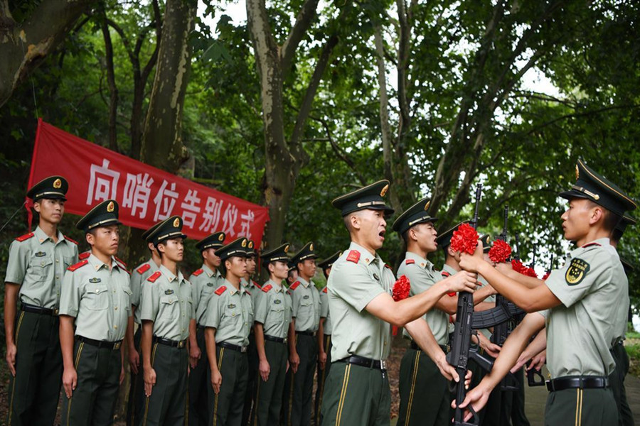 8月27日,武警安徽總隊(duì)合肥支隊(duì)執(zhí)勤六中隊(duì)單獨(dú)執(zhí)勤排即將退伍的老兵將手中鋼槍交給戰(zhàn)友,告別軍營(yíng)奔赴新的征途。