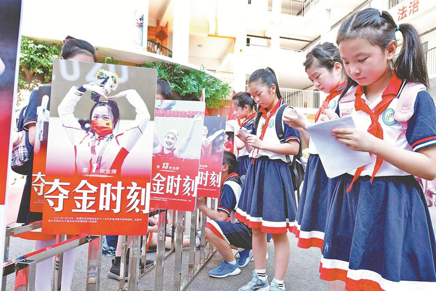 8月31日,安慶市迎江區華中路第一小學開展“學習奧林匹克精神 爭做新時代好少年”愛國主義主題教育活動,學生們通過宣傳展板,學習奧運冠軍的拼搏精神。 通訊員 黃有安 余燕 攝