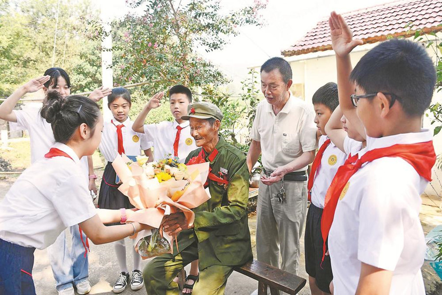8月31日,含山縣環峰小學學生和新時代文明實踐中心等單位的志愿者們走進陶廠鎮卜李村,聆聽97歲的抗戰老兵沈永道講述革命故事,接受愛國主義教育。 通訊員 歐宗濤 攝