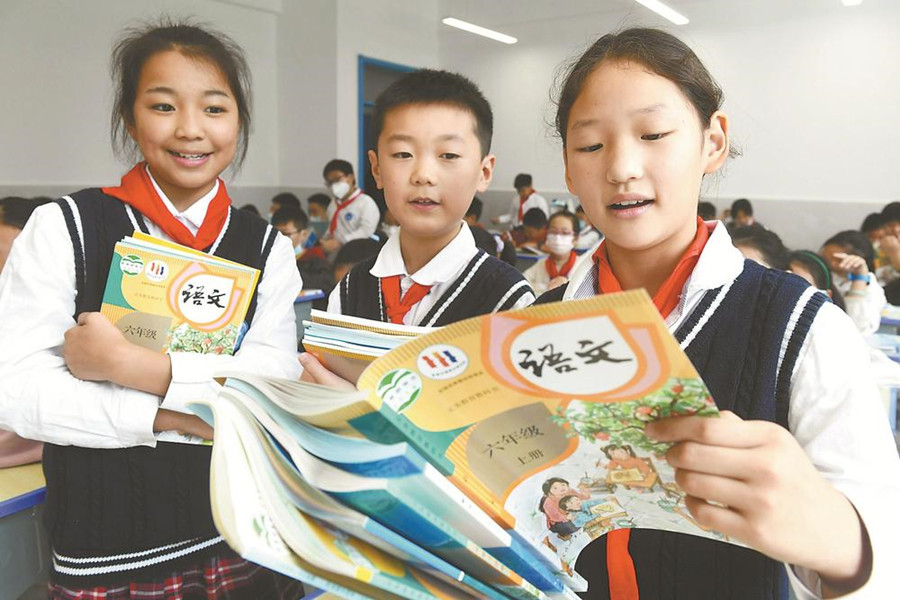8月31日,新建成的阜陽市潁東區(qū)育新小學潁河校區(qū),小學生們領到新課本。 特約攝影 王彪 攝
