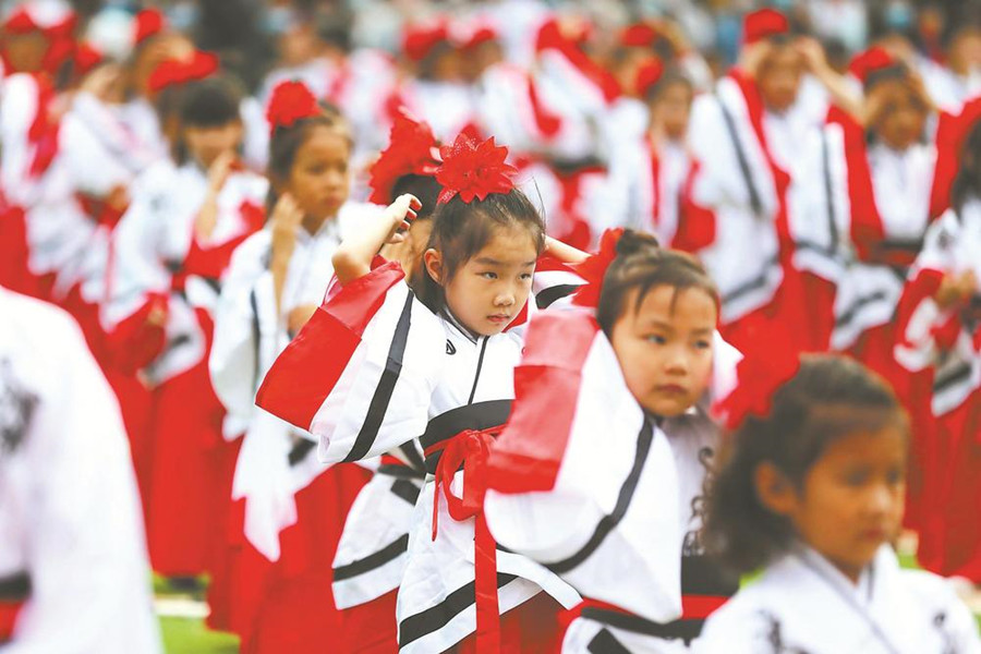8月31日,淮北市黎苑小學為一年級新生舉辦傳統(tǒng)“開筆禮”儀式。200多名新生身著漢服走過“三重門”,開啟新的學習生涯。 通訊員 萬善朝 攝