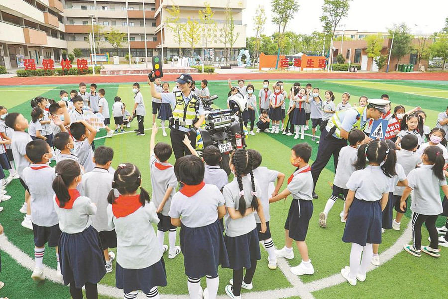 8月31日,在合肥市徽州小學美丹校區(qū)的校園內,公安交警正對孩子們開展“開學第一課”交通安全宣傳教育。 通訊員 汪宜勝 攝