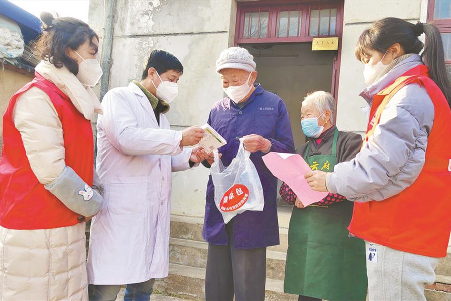 1月8日,志愿者和醫護人員到桐城市太平社區七胡莊組82歲的王如范和81歲的胡菊華家中,為老人免費發放“防疫健康包”。連日來,太平社區志愿者和醫護人員走村串戶到轄區內高齡、獨居困難老人家中免費發放“防疫健康包”,面對面宣傳預防病毒感染和科學用藥知識。目前,該社區共發放“健康愛心包”200多份、小份退熱藥150多份。