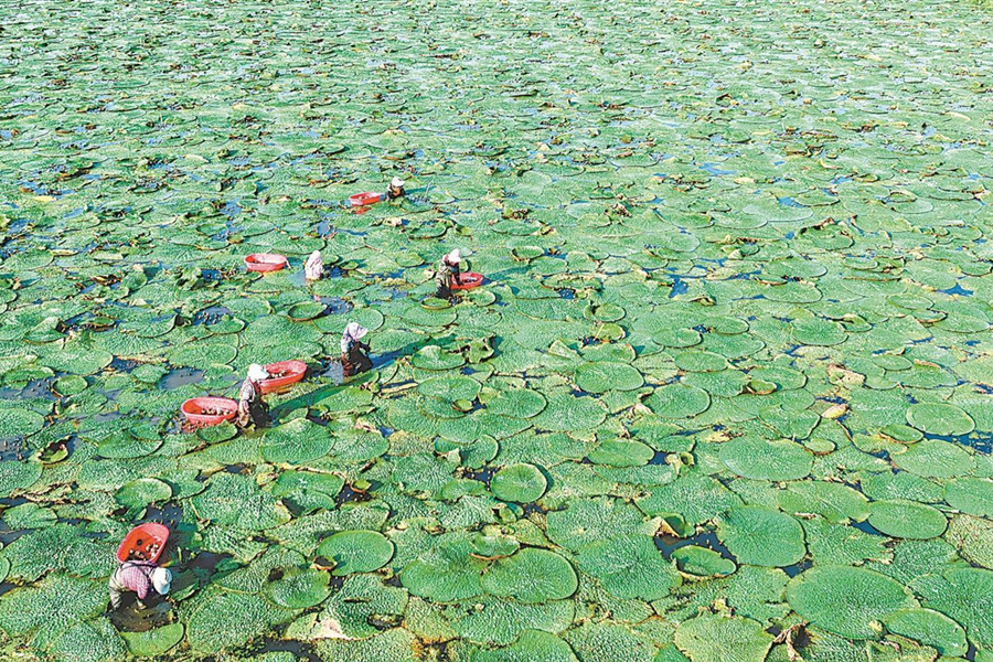 9月8日,在來安縣三城鎮三城村玉茂家庭農場,連片的芡實葉鋪滿水面,工人們抓緊采摘成熟的芡實。近年來,來安縣致力發展高產高效農業,因地制宜開展特色農產品種植,促進農業增效、農民增收。