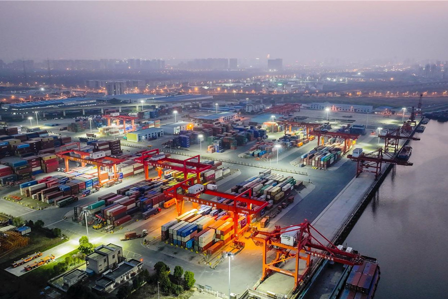 3月15日,合肥港國際集裝箱碼頭燈火通明,貨輪在泊位上有序裝卸作業。