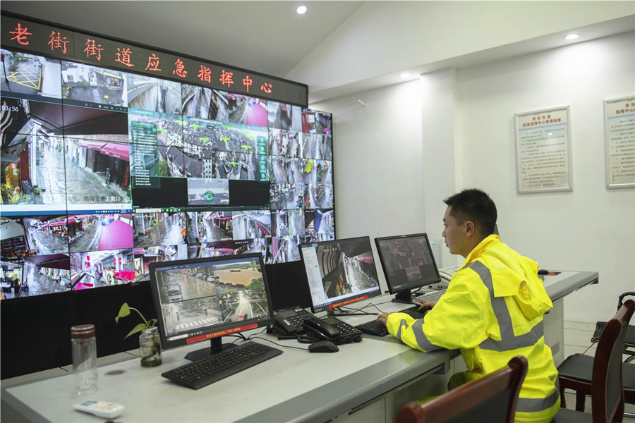 6月26日,在黃山市屯溪區(qū)老街街道應(yīng)急指揮中心,老街專職消防隊(duì)隊(duì)長程順富查看全國重點(diǎn)文物保護(hù)單位屯溪老街內(nèi)積水情況。新華社記者 傅 天 攝
