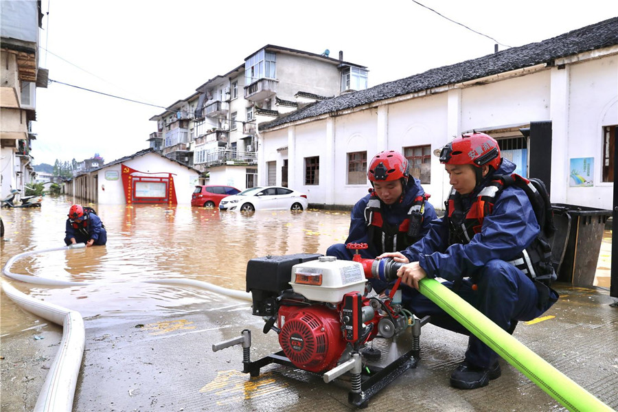 6月23日,黃山市消防救援支隊(duì)屯光特勤站指戰(zhàn)員在黃山市屯溪區(qū)進(jìn)行排澇作業(yè)。記者 許 昊 攝