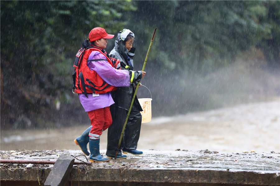 6月26日,山越救援隊(duì)隊(duì)員程紅梅(左)在黃山市歙縣紹濂鄉(xiāng)和平村幫助村民過橋。新華社發(fā)(樊成柱 攝)
