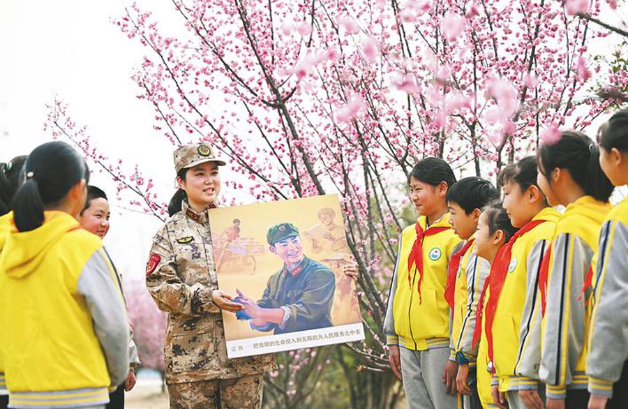 3月1日,肥西縣紫蓬鎮(zhèn)民兵在向?qū)W生講述雷鋒故事。 通訊員 徐偉 攝