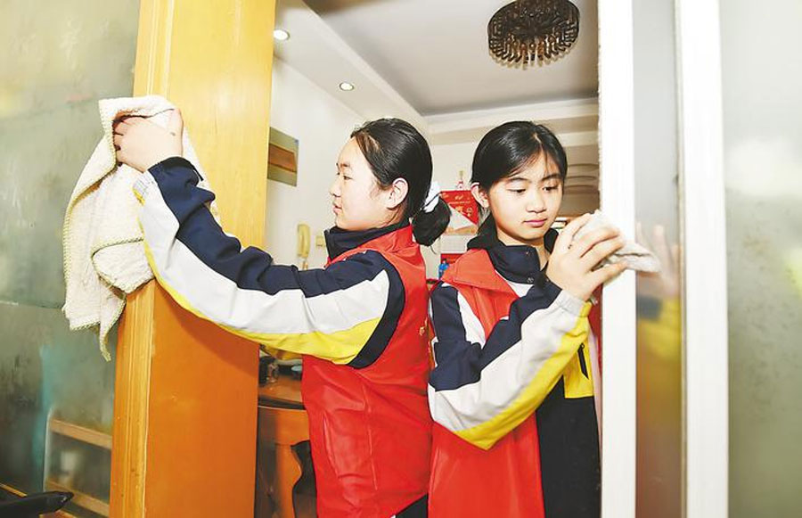 3月2日,在合肥市金都華庭小區(qū),中學(xué)生志愿者幫助老人打掃家庭衛(wèi)生。 通訊員 葛傳紅 攝