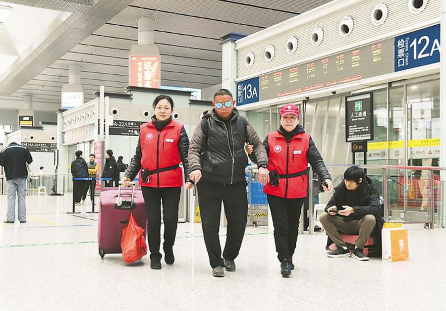 3月5日,在合肥南站,志愿者攙扶視障人士出站。 合肥日?qǐng)?bào)-合新聞?dòng)浾?郭如琦 攝