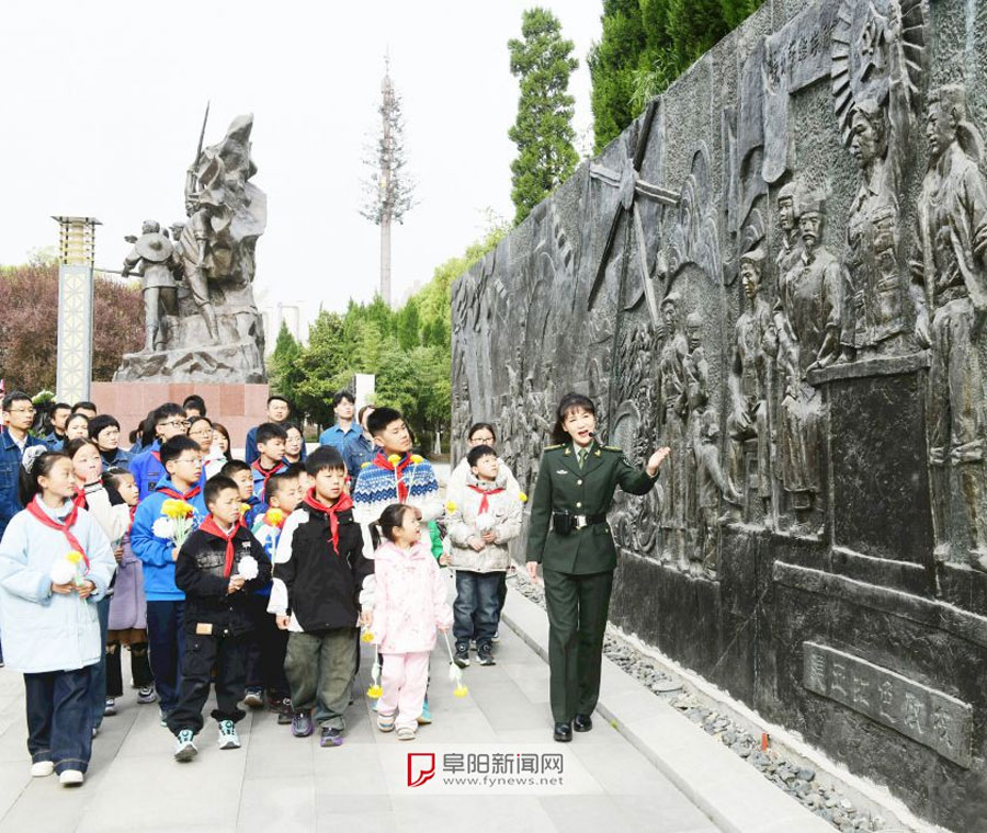 圖為3月29日,部分中小學(xué)生在阜陽(yáng)市和平公園烈士浮雕旁聆聽講解員講述英烈事跡。