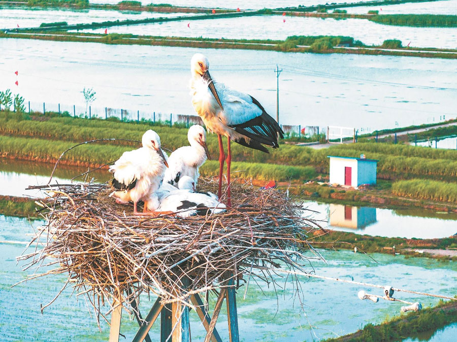 東方白鸛是國家一級保護動物,也是世界瀕危物種。今年2月,一對東方白鸛在輸電鐵塔上的鳥巢里產卵,當地供電部門與保護區迅速行動,安裝監控設備、安排專人巡護,并聯合養殖戶投放魚蝦,保障其食物供應,共同維護美好生態。
