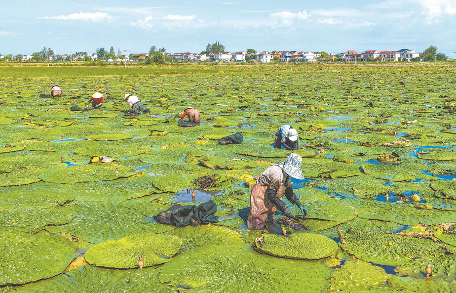 8月7日,廬江縣白湖鎮(zhèn)杭頭社區(qū)的水田里,農(nóng)民們?cè)趽屪マr(nóng)時(shí)采收芡實(shí)。近年來,廬江縣鼓勵(lì)農(nóng)民種植芡實(shí),小小芡實(shí)成了農(nóng)民“致富果”。本報(bào)通訊員 左學(xué)長(zhǎng) 攝