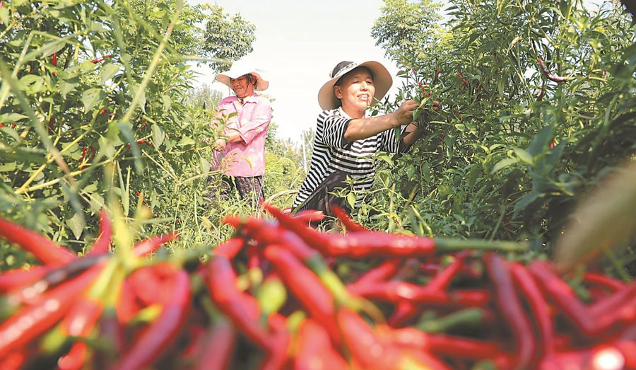 8月3日,阜陽市潁東區(qū)袁寨鎮(zhèn)范溝村辣椒種植基地,村民們?cè)诓烧苯饭?yīng)市場(chǎng)。近年來,當(dāng)?shù)卮罅Πl(fā)展辣椒種植和加工產(chǎn)業(yè),促進(jìn)農(nóng)民增收。本報(bào)通訊員 宿飛 攝