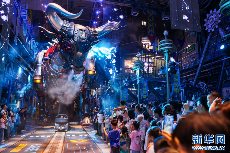 ??今年暑期,位于安徽省淮北市相山區(qū)的機械巨獸IP主題街區(qū)夔牛天街人潮涌動,曾經(jīng)轟鳴半個世紀(jì)的老電廠化身為融合科技、藝術(shù)與工業(yè)美學(xué)的奇幻空間,吸引眾多游客前來體驗游玩。新華網(wǎng)發(fā)(王文 攝)