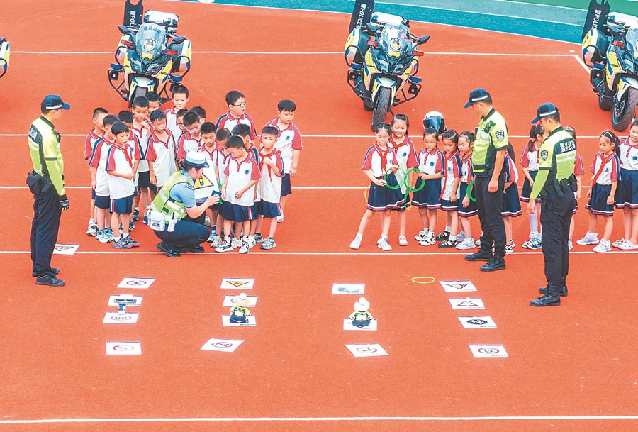 9月1日,在蕪湖市繁昌區(qū)繁陽鎮(zhèn)城關(guān)四小,交警組織學(xué)生通過“套圈識(shí)標(biāo)志”游戲強(qiáng)化交通標(biāo)識(shí)認(rèn)知。通訊員 肖本祥 攝