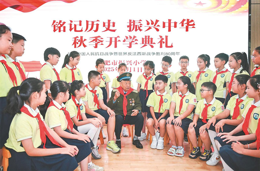 9月1日,在合肥市振興小學(xué),原中國人民解放軍空軍某部離休干部馬仁科在向孩子們講述抗戰(zhàn)故事,引導(dǎo)青少年銘記歷史,傳承和弘揚(yáng)偉大抗戰(zhàn)精神。記者 張大崗 攝