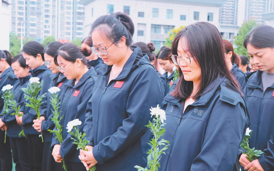 9月18日,伴隨著防空警報的拉響,阜陽市實(shí)驗(yàn)小學(xué)北京路校區(qū)全體師生手捧潔白的菊花,整齊列隊(duì),寄托哀思。特約攝影 王彪 通訊員 萬媛媛 攝