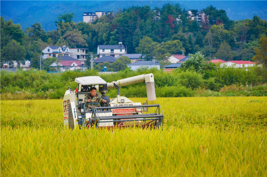 10月21日,在安慶市岳西縣“稻油輪作”基地,農機手駕駛收割機在搶收水稻。近年來,岳西縣通過推行“稻油輪作”“稻麥輪作”等多元化種植模式,促進農民增收。本報通訊員 吳均奇 攝