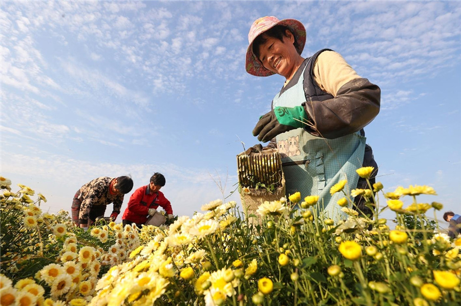 10月22日,在淮北市相山區渠溝鎮徐集村菊花種植基地,當地農民在采摘菊花。近年來,該鎮引導農戶種植菊花、牡丹等作物,拓寬農民增收渠道。本報通訊員 黃鶴鳴 攝