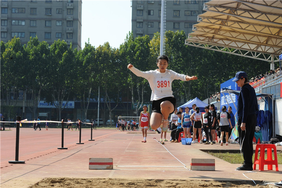 10月22日,合肥市瑤海全民健身中心,學生們正在參加比賽。當天,瑤海區舉行第二十三屆中小學生田徑運動會,來自全區43所中小學的682名運動員在68個競賽項目中展開角逐。本報通訊員 熊偉 攝