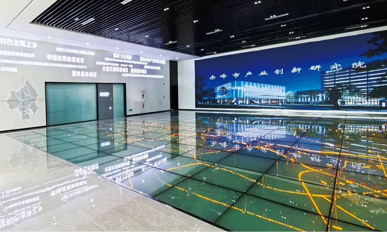 踏入赤峰市高新區規劃展示館,透過透明玻璃地磚,腳下被點亮的園區電子規劃展示圖頗為亮眼。